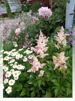 Nu blommar Astilben här tillsammans med mitt favoritogräs den söta Mattram som jag kallar den.En växt som jag har på allehanda ställen både i krukor och i rabatter har turen att den kommer på många olika ställen och jag samlar ihop  dem där jag ser dem komma och planterar dem där jag vill ha dem. Det är en växt som håller sig hela sommaren.